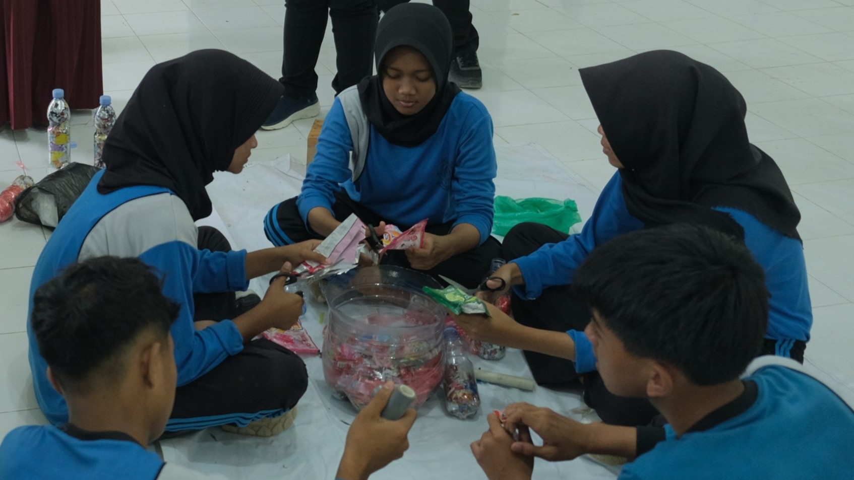 Pernyataan tersebut menjadi pembuka yang tepat untuk aksi pembuatan ecobrick—mengemas limbah plastik bekas kemasan menjadi botol-botol padat yang dapat dimanfaatkan ulang. Para siswa dengan antusias mengisi botol-botol plastik dengan sampah non-organik hingga keras, yang nantinya akan disusun menjadi berbagai furnitur kreatif.