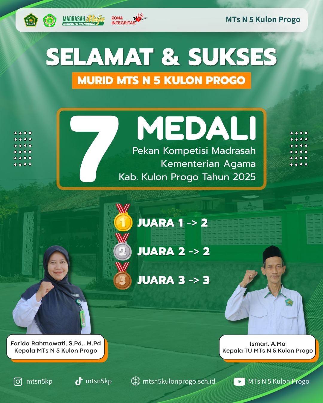 Kulon Progo (MTsN5KP) – Semangat berprestasi kembali ditunjukkan oleh MTs Negeri 5 Kulon Progo. Dalam ajang Pekan Kompetisi Madrasah (PKM) 2025, kontingen MTsN 5 Kulon Progo berhasil mencatat prestasi gemilang dengan membawa pulang tujuh trofi juara dari berbagai cabang lomba. Hasil ini menjadi bukti nyata kerja keras siswa dan guru dalam menumbuhkan budaya kompetitif dan semangat unggul di madrasah.