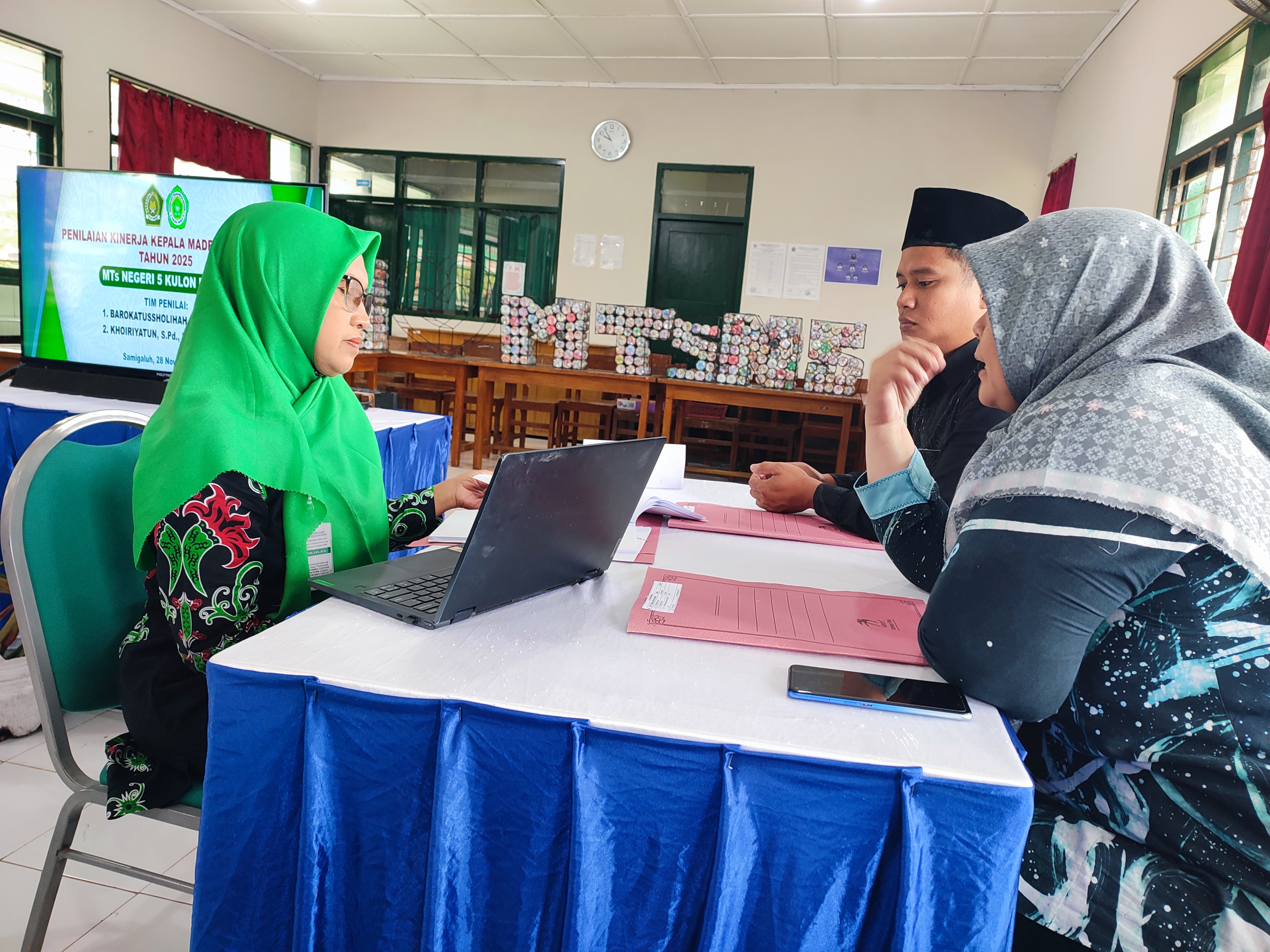 Kulon Progo (MTsN5KP) — Penilaian Kinerja Kepala Madrasah (PKKM) MTsN 5 Kulon Progo dilaksanakan pada Jumat, 28 November 2025, bertempat di Laboratorium IPA MTsN 5 Kulon Progo. Kegiatan ini dihadiri oleh dua pengawas madrasah, yaitu Barokatussholihah, S.Ag., M.S.I. dan Khoiriyatun, S.Pd., M.Sc., yang bertugas menilai kinerja Kepala Madrasah selama satu tahun terakhir. Suasana kegiatan berlangsung tertib dan penuh kesiapan dari seluruh tim madrasah.
