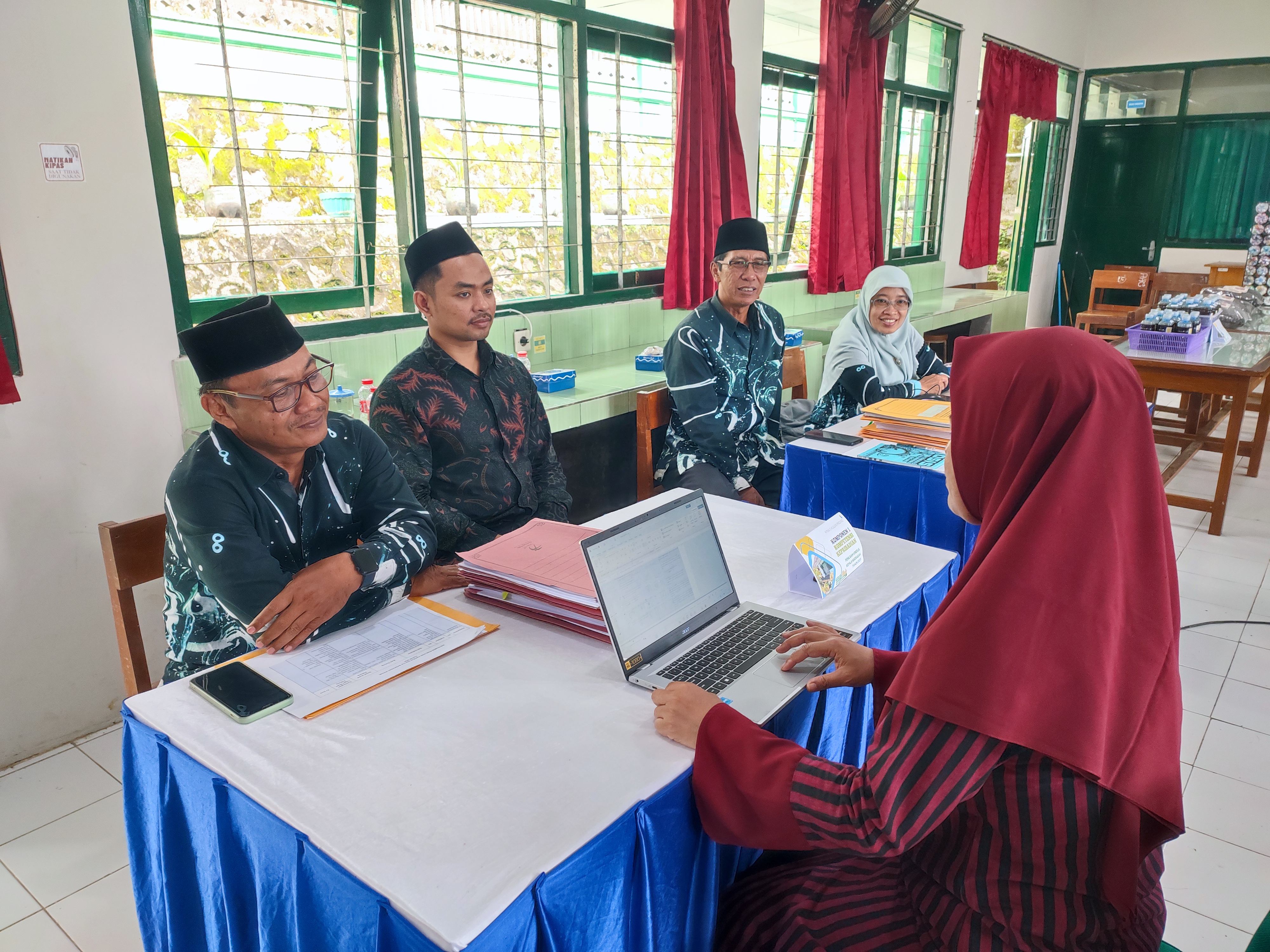 Setelah sesi pemaparan, kedua pengawas melanjutkan kegiatan dengan melakukan peninjauan bukti fisik dokumen di setiap komponen penilaian. Tim madrasah telah menyiapkan seluruh berkas dengan rapi, dan pengawas meneliti dokumen satu per satu sambil berdialog dan memberikan masukan terkait beberapa aspek administrasi. Proses pemeriksaan berlangsung kondusif dan penuh keterbukaan.