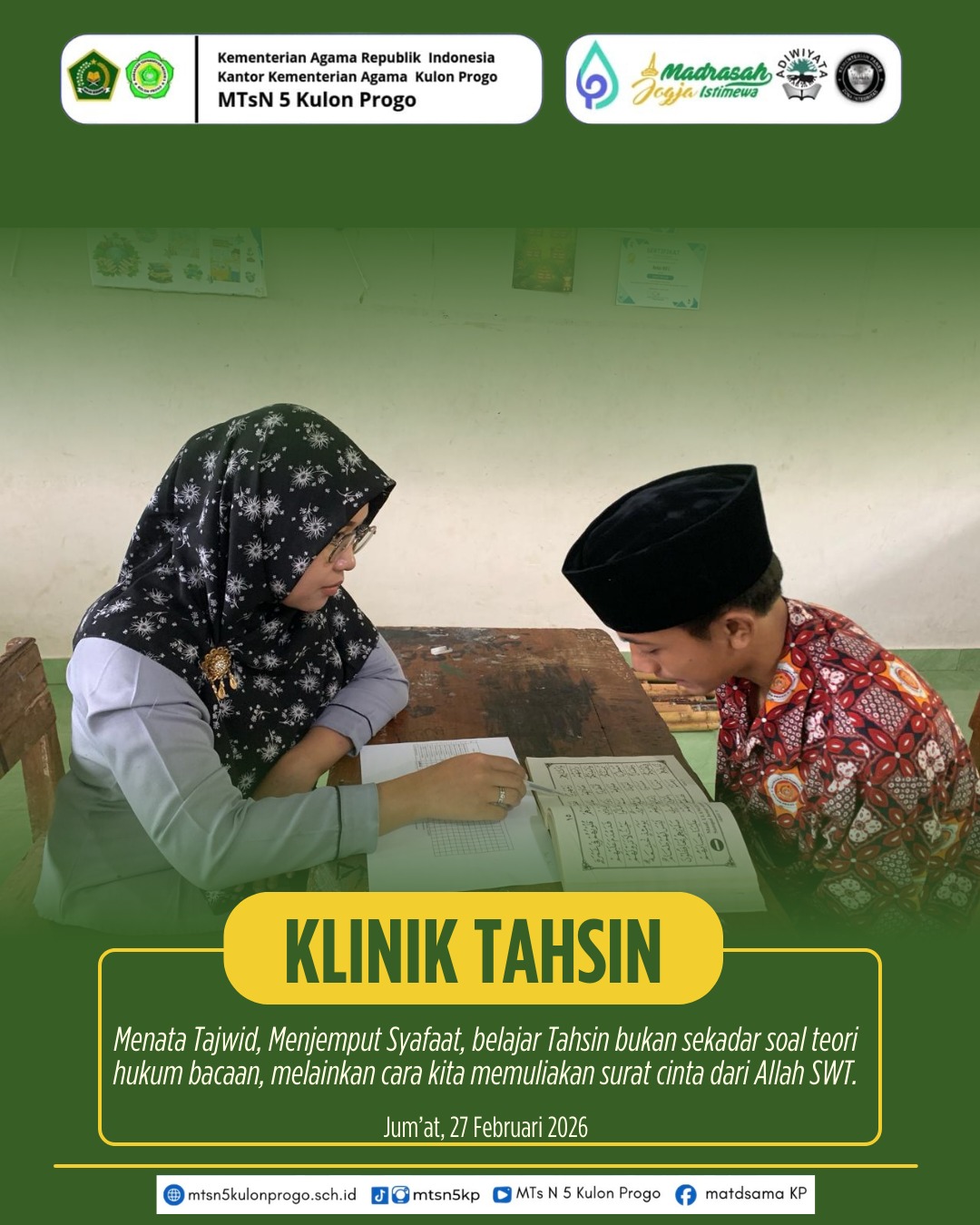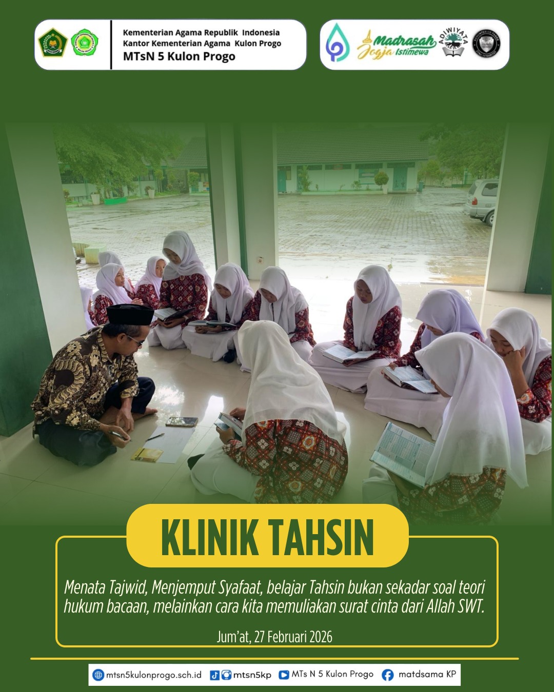 Kulon Progo (MTsN5KP) — Dalam rangka mengisi kegiatan bulan suci Ramadan, MTsN 5 Kulon Progo menyelenggarakan kegiatan kokurikuler bertajuk Klinik Tahsin Al-Qur’an pada Jumat, 27 Februari 2026. Kegiatan ini menjadi bagian dari program pembinaan keagamaan yang difokuskan pada peningkatan kualitas bacaan Al-Qur’an siswa.