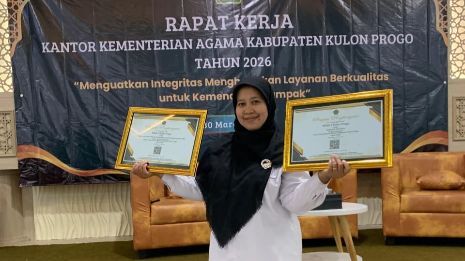 Penghargaan tersebut diterima langsung oleh Kepala MTsN 5 Kulon Progo, Farida Rahmawati, S.Pd., M.Pd. dari Kepala Kankemenag Kabupaten Kulon Progo, H. Muhamad Wahib Jamil, S.Ag., M.Pd. Penyerahan dilakukan di akhir sesi Rapat Kerja Kankemenag Kulon Progo di Aula Gedung PLHUT, Senin (30/03/2026).