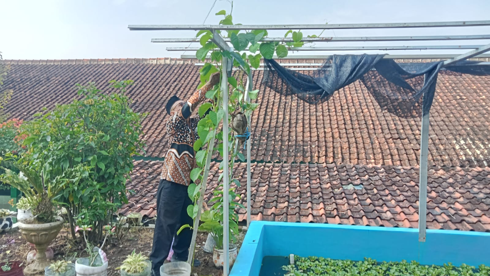 Selain pembersihan fisik, dilakukan pula upaya revitalisasi vegetasi melalui pemupukan tanaman. Hal ini bertujuan agar tanaman di sekitar kolam tetap subur dan mampu berfungsi sebagai penyaring udara alami sekaligus menambah estetika lingkungan madrasah yang sedang dipersiapkan menuju standar Adiwiyata yang lebih tinggi.